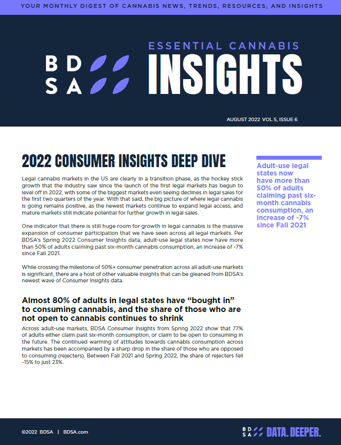 One indicator that there is still huge room for growth in legal cannabis is the massive expansion of consumer participation that we have seen across all legal markets. Per BDSA’s Spring 2022 Consumer Insights data, adult-use legal states now have more than 50% of adults claiming past six-month cannabis consumption, an increase of ~7% since Fall 2021.