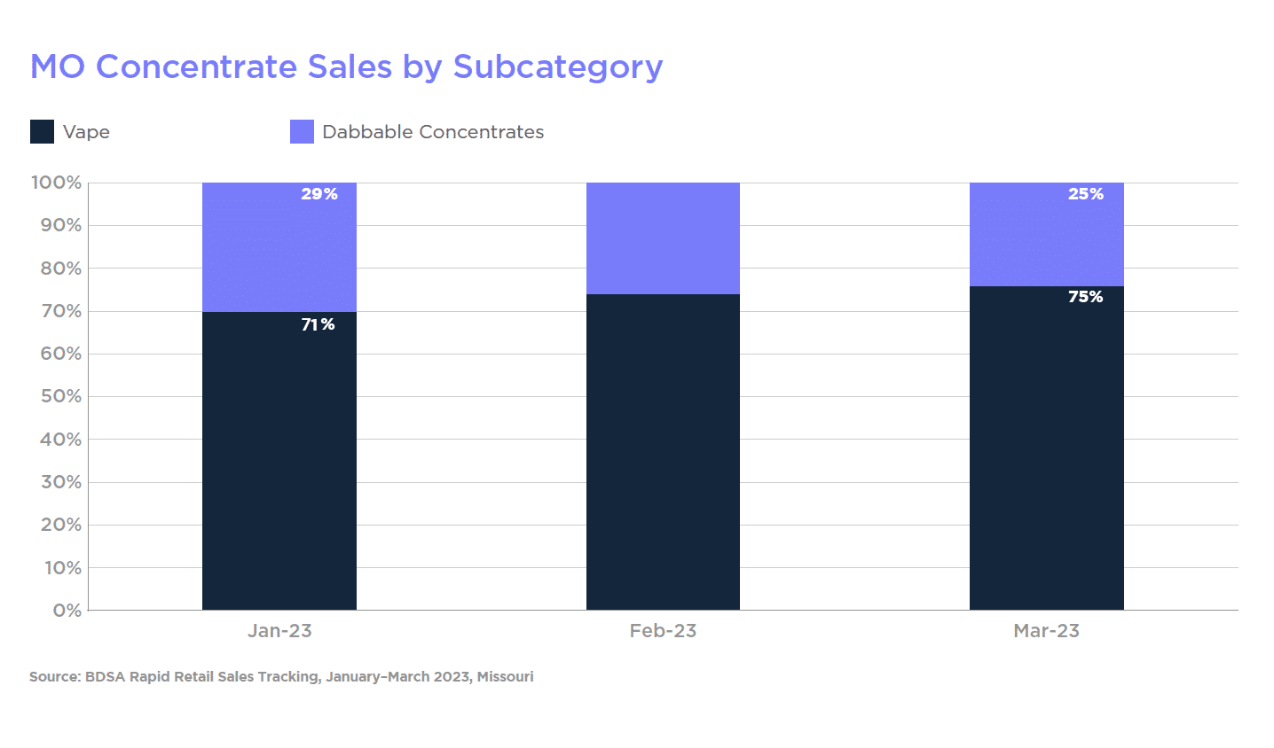 The biggest shift seen in product share in the first months of sales was within the Concentrates category, with Vape sales growing significantly with the addition of adult-use. BDSA Rapid Retail Sales Tracking data show that Vape’s share of total dollar Concentrate sales grew from 71% in January 2023, to 75% in March 2023, with most of this growth coming from increased Vape sales in the adult-use channel.