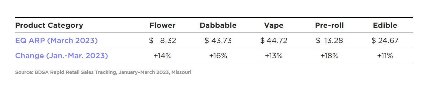 Boasting a 21+ population of 4.6 million in 2023, and an even larger pool of potential consumers if you include neighboring states with limited legal access, the addition of adult-use dramatically increased the access, and therefore demand for cannabis products in the Missouri market. Product shortages have been reported, in turn leading to price spikes. Between January 2023 and March 2023, equivalent average retail prices (EQ ARP) increased 15% in the total Missouri market.