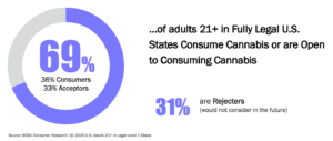 Today, more than 80% of the U.S. population agrees with some form of legalization, and that number is growing. Additionally, acceptance of cannabis is growing, with nearly 70% of adults 21+ living in fully legal states identifying as cannabis consumers OR as being open to consuming.