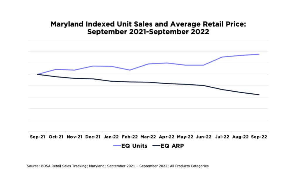 Like most developed cannabis markets, Maryland has seen retail cannabis prices fall significantly since Q3 2021. Between September 2021 and September 2022, equivalent average retail cannabis prices fell ~35% in the Maryland cannabis market, higher than the price compression seen even in some more mature markets. While dollar sales have stagnated largely driven by price declines, equivalent unit sales have continued to grow, reaching an all-time high in September 2022.