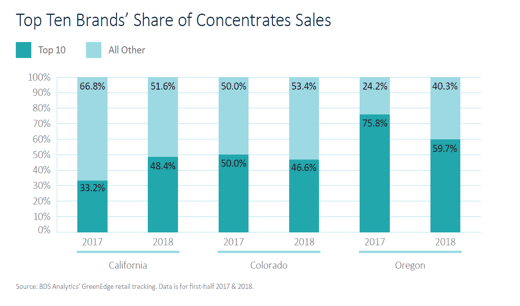 Now, market share is roughly tied at 48 percent each for branded products — edibles, most concentrates and topicals — and unbranded products, including most flower and pre-rolls. And dollar sales growth through 2018 is led by branded products. In fact, in Colorado and Oregon, where year-over-year comparisons are useful (as opposed to California, which last year was a medical marketplace only), dollar sales of flower are down 6 percent through October of this year. Meanwhile, growth for edibles in the same states reached 21.5 percent through October; growth is even stronger among concentrates.
